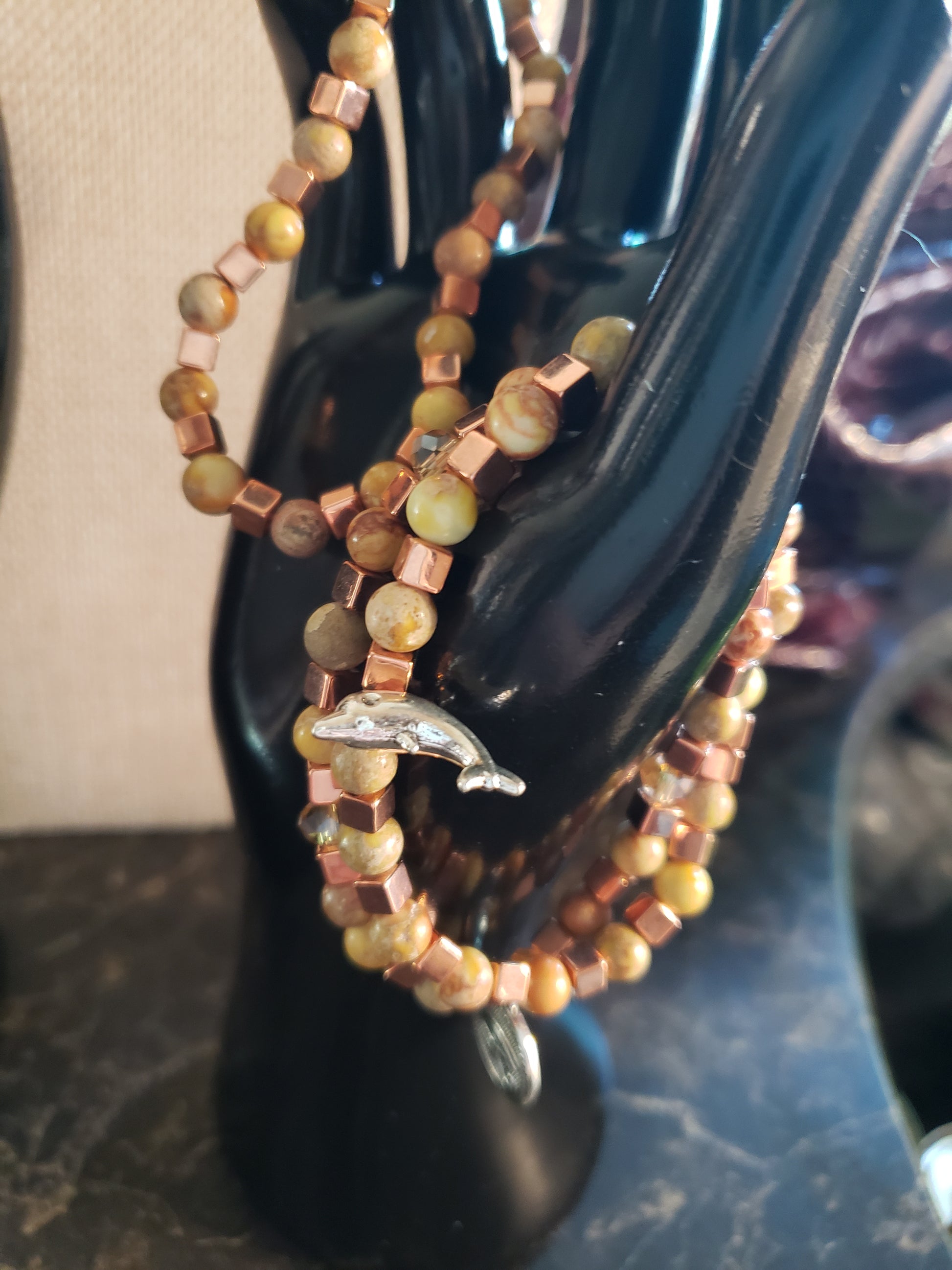 Embrace the earthy beauty with our stretchy bracelet featuring copper accents and yellow agate beads. Connect with nature and add a touch of warmth to your style. Feel confident and grounded while wearing this stunning piece.